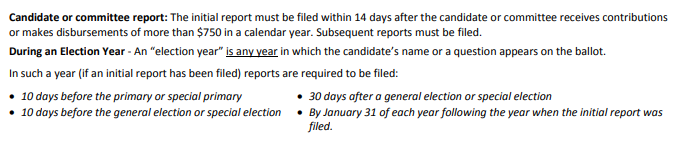 - When either the candidate or candidates committee receives and/or disburses $750, the first report is required within 14 days.