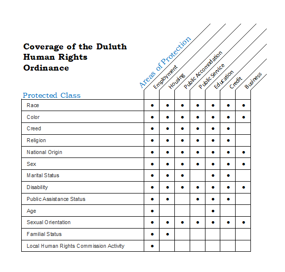 This chart shows the classes that are protected in employment, housing, education, public accommodations, public services, education, credit services, and business. If you feel you have been the victim of discriminated in one of these areas and would like more information on your rights, view our discrimination complaint process.