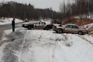 A Duluth Police Officer arrived on scene and activated the squads emergency lights and went down to the over turned Ford Bronco. Behind the Bronco there was a Ford Taurus that had also already slid into the ditch. The officer was near the Bronco talking with the drivers when a Buick LeSabre, southbound on South Arlington Avenue lost control on the icy road and hit the rear of the squad car causing major damage. The LeSabre bounced off the squad car and slid into the ditch and struck the Ford Taurus.