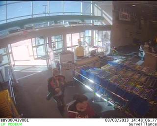 On Sunday, March 3rd, 2013 at approximately 2:30 PM to 3:00 PM there was a vehicle prowl at the Snowflake Nordic Ski Center, 4348 Rice Lake Road, where suspect(s) broke a vehicle’s window to steal a purse inside. The suspect(s) then went to Best Buy and Dunham’s Sport and purchased over $1,000 worth merchandise. The two suspects are both female – one has brown hair and is wearing a red sweatshirt and the other has blonde hair and is wearing a black jacket with a fur collar. The suspect’s images were captured on a surveillance camera.