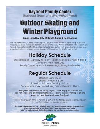 Regular hours for the Bayfront Family Center Warming House and rink are Monday-Friday, 4:00-8:00 PM; Saturday 1:00-8:00 PM, Sundays 1:00-5:00 PM.