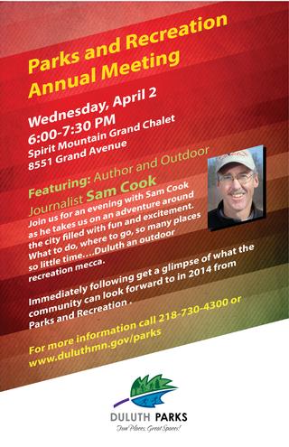 Immediately following Sam Cook’s talk, the Parks and Recreation Commissioners and City Staff members will share what progress has been made and what is being planned for 2014. This event is FREE. For more information call the Parks and Recreation office at 218-730-4300.