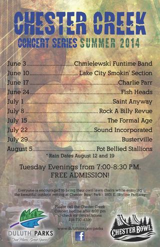 Please call the Chester Creek Concert Hotline at 218-730-4326 after 6:00 pm the night of the concert or check our Facebook page “DuluthParksMN” or go to www.duluthmn.gov/parks for weather related cancellations or updates.