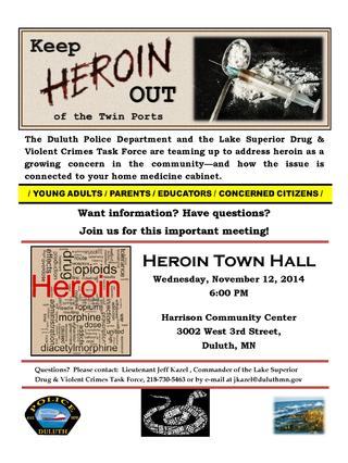 [Duluth, MN] – A presentation to address the heroin effects and growing concern in the community will take place at the Harrison Community Center, 3002 West 3rd Street. Presenter will be Lieutenant Jeff Kazel from the Duluth Police Department.