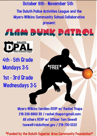 the Slam Dunk Patrol Banquet on Wednesday, November 5, 2014 from 4 p.m. till 6 p.m. at Meyers Wilkins School located at 1027 N 8th Ave E in Duluth. Any questions, please contact Officer Sewell at 218-730-5890.