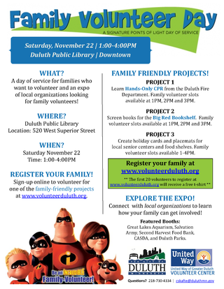 Family Volunteer Day will feature family friendly projects and an expo of local organizations that are looking for family volunteers. Projects include Hands-Only CPR taught by the Duluth Fire Department, screening books for the Big Red Bookshelf, and creating holiday cards and placemats for local senior centers and food shelves. Featured organizations include Great Lakes Aquarium, Salvation Army, Second Harvest Northern Lakes Food Bank, CASDA, and the City of Duluth Parks and Recreation.