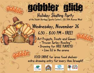 [Duluth, MN] – The City of Duluth Parks and Recreation division invites the public to a free Gobbler Glide ice skating event at the Duluth Heritage Sports Center, 120 30th Ave West, on November 26, 2014 from 6:30-8:00 PM. Participants will be able to create art projects, play games, enjoy music, and have treats!