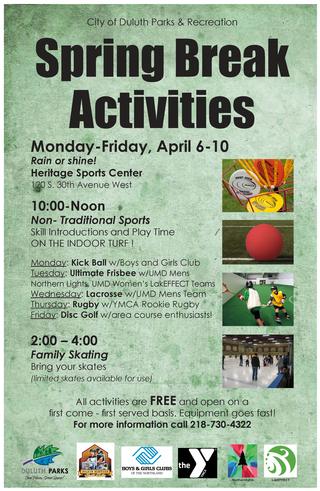 [Duluth, MN] – Don’t let your kids get bored during spring break. Bring them out for some free fun indoor activities at the Duluth Heritage Sports Center (120 S. 30th Avenue West) during the week of April 6-10, 2015.