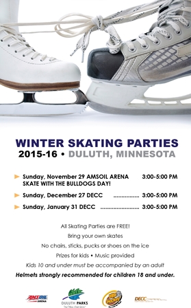 [Duluth, MN] - On November 29, the City of Duluth Parks and Recreation and the University of Minnesota Duluth (UMD) have teamed up to offer free open ice skating with members of the UMD Bulldogs from 3-5 PM at the DECC AMSOIL Arena. The public is encouraged to participate in this free skating event that is perfect for all ages. There will be music and free prizes for kids. Participants must bring their own skates. Children under 10 years of age must be supervised by an accompanying adult. The next scheduled open skate events at the DECC are December 27, 2015 and January 31, 2016 from 3-5 pm in the DECC ice arena (350 Harbor Drive), located on the lower level.