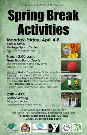 [Duluth, MN] – Don’t let your kids get bored during spring break. Bring them out for some free fun indoor activities at the Duluth Heritage Sports Center (120 S. 30th Avenue West) during the week of April 4-8, 2016