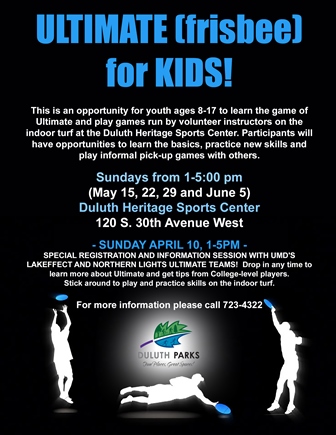 [Duluth, MN] - The City of Duluth Parks and Recreation division is partnering with the Duluth Heritage Sports Center (120 S. 30th Ave West) and the UMD LAKEFFECT and Northern Lights Ultimate teams to offer ultimate frisbee sports for area youth every Sunday during from May 15 to June 5. The first practice session is offered this weekend on April 10 from 1-5 PM. The regular program runs from 1-5:00 PM during which volunteers will teach kids how to play the sport and coordinate informal games with participants.