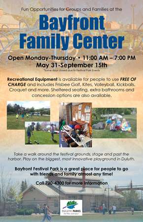 [Duluth, MN] - The City of Duluth Parks and Recreation division is inviting the public to take advantage of fun free activities and recreational equipment offered Monday through Thursday, now until September 15 during the hours of 11 AM to 7 PM, at the Bayfront Family Center. Visitors to the Family Center will have access to the use of kickballs, croquet sets, kites, volleyballs, and frisbees. Concessions and restroom facilities are also available.