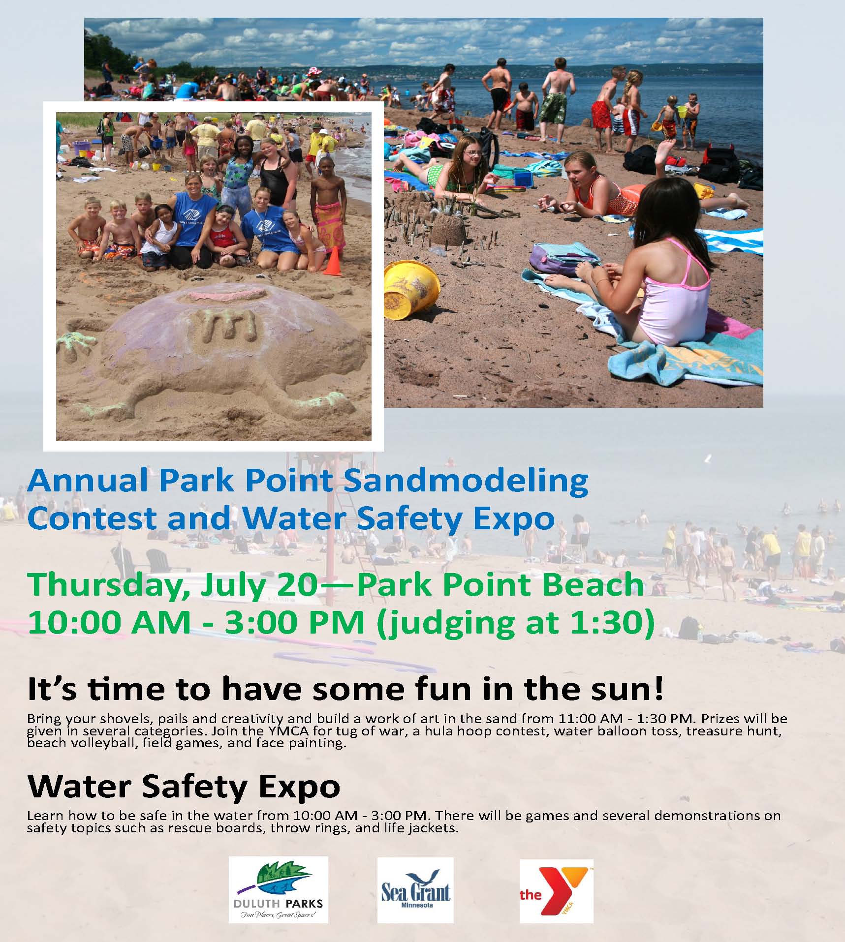 [Duluth, MN] - The Annual Park Point Sand Modeling Contest/Summer Beach Bash and Water Safety Expo is scheduled for Thursday, July 20, 2017 at the Park Point Beach House from 10:00 AM-3:00 PM. The event will feature a sand modeling contest, games and several demonstrations on safety topics such as rescue boards, throw rings, life jackets in addition to demonstrations on weather safety, rip currents and kayaking. This event is free and open to the public.