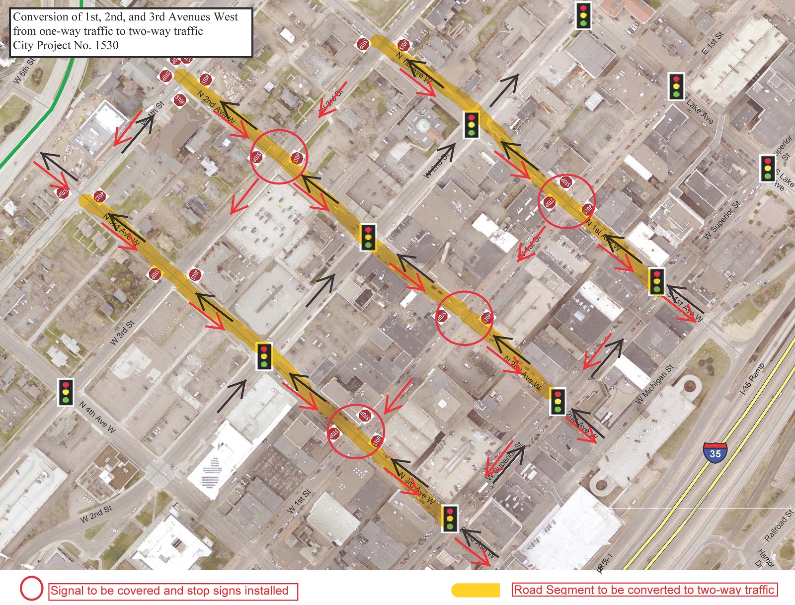 The conversion was introduced this past winter and approved by the Duluth City Council with a planned approach in multiple stages. The work will involve signage changes, center line striping and covering four traffic signals and installing stop signs. Please see the details below and the project map for exact locations. The West 1st, 2nd, and 3rd Streets will remain one-way traffic.