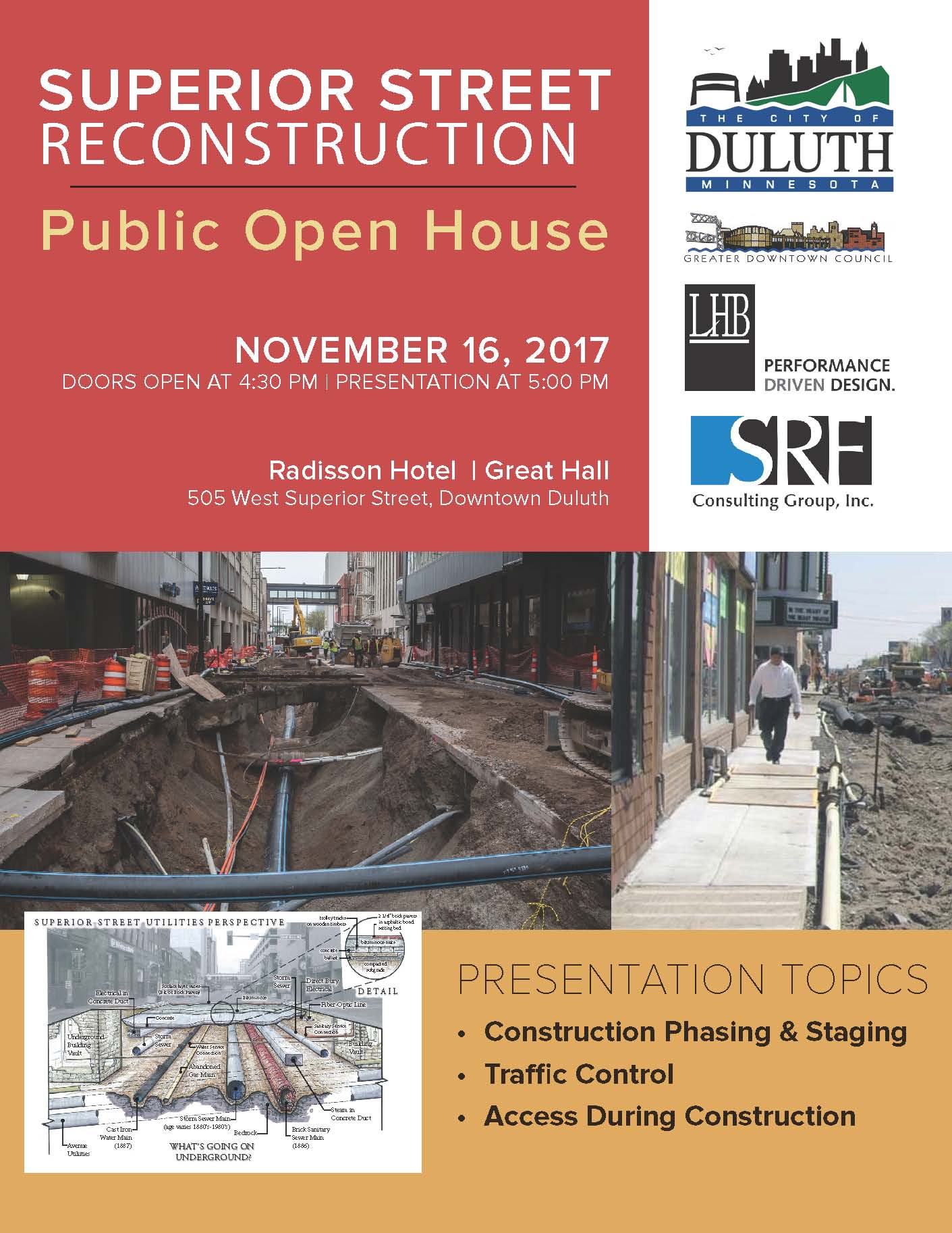 City staff and consultants from LHB will review the construction phases, timeline, staging, access during construction, traffic controls, and communications. The entirety of the project will be discussed even though the first phase will encompass only the western end of Superior Street between 7th ave West and up to 3rd Ave West, not including the 3rd Ave West intersection. Phase 1 is slated to start in the spring of 2018.