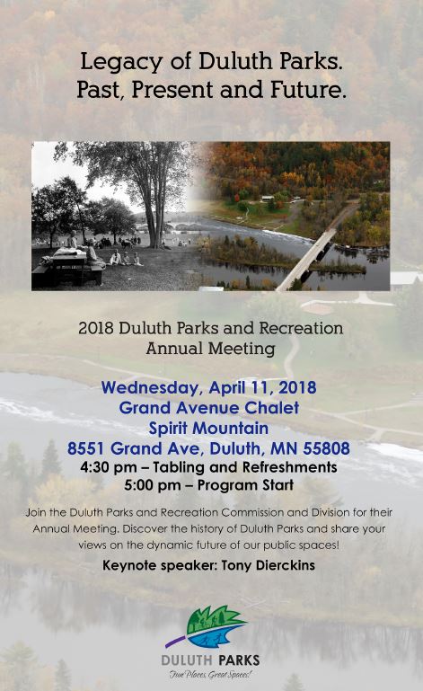 [Duluth, MN] - The Duluth Parks and Recreation Commission will be hosting its annual meeting highlighting the "Legacy of Duluth Parks. Past, Present and Future," on Wednesday, April 11 at the Spirit Mountain Grand Avenue Chalet, 8551 Grand Ave at 4:30 pm. The public will learn more about the past year's achievements, partnerships and initiatives from the Parks Commission and Parks staff before hearing from keynote speaker and local author, Tony Dierckins.