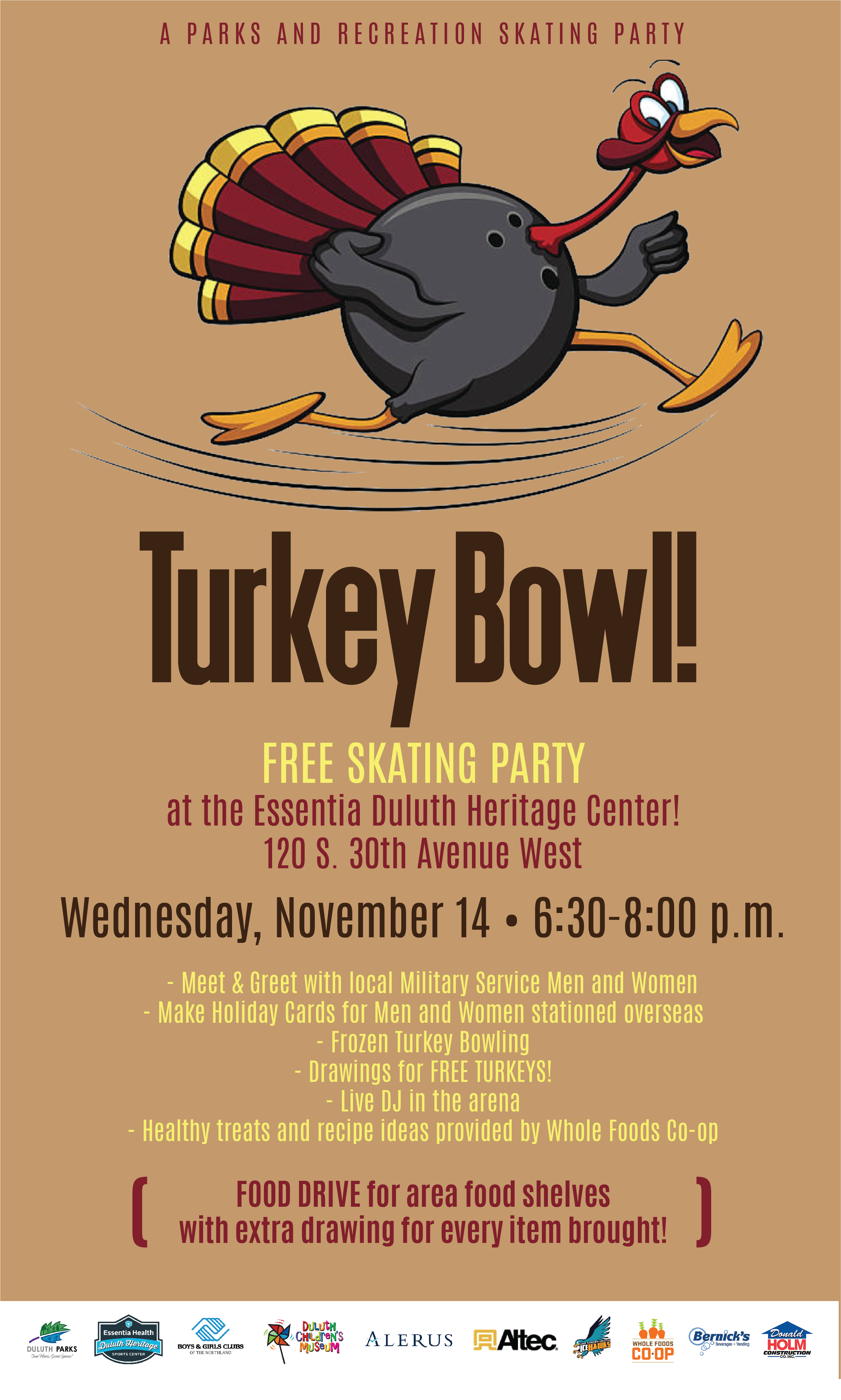 [Duluth, MN] - The City of Duluth Parks and Recreation division is hosting a Turkey Bowl event on Wednesday, November 14th from 6:30-8:00p.m at the Essentia Duluth Heritage Center, 120 S. 30th Ave West! This event is a FREE to the public and will include frozen turkey bowling, drawings for free turkeys, live DJ, and healthy treats provided by Whole Food Co-op! Children should be accompanied by an adult. Limited skates are available for free use.