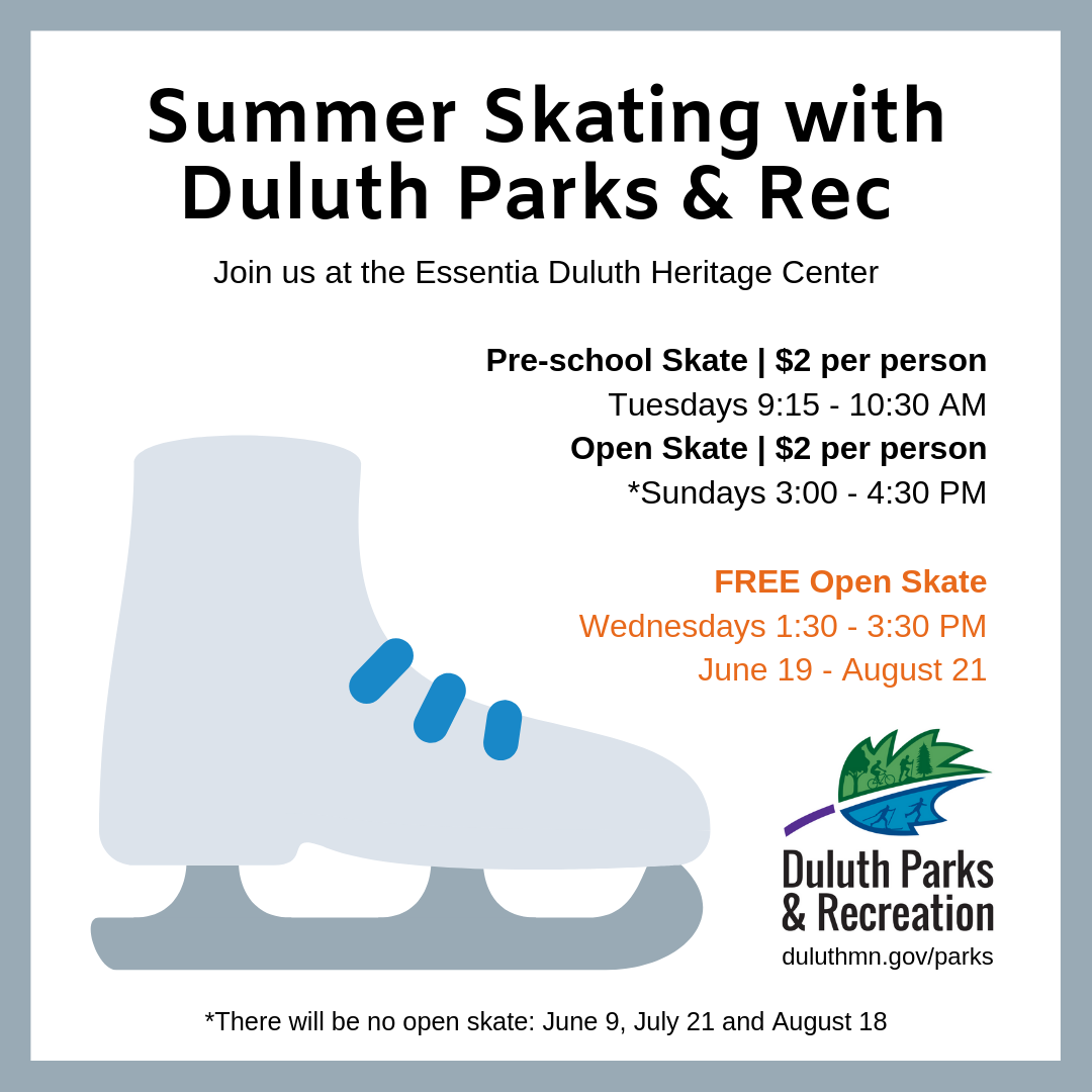 [Duluth, MN] The City of Duluth Parks and Recreation department will host its first free open skate tomorrow, Wednesday, June 19, at the Essentia Duluth Heritage Center from 1:30-3:30 p.m. Open skate is free and will be open the public every Wednesday during this time through August 21.