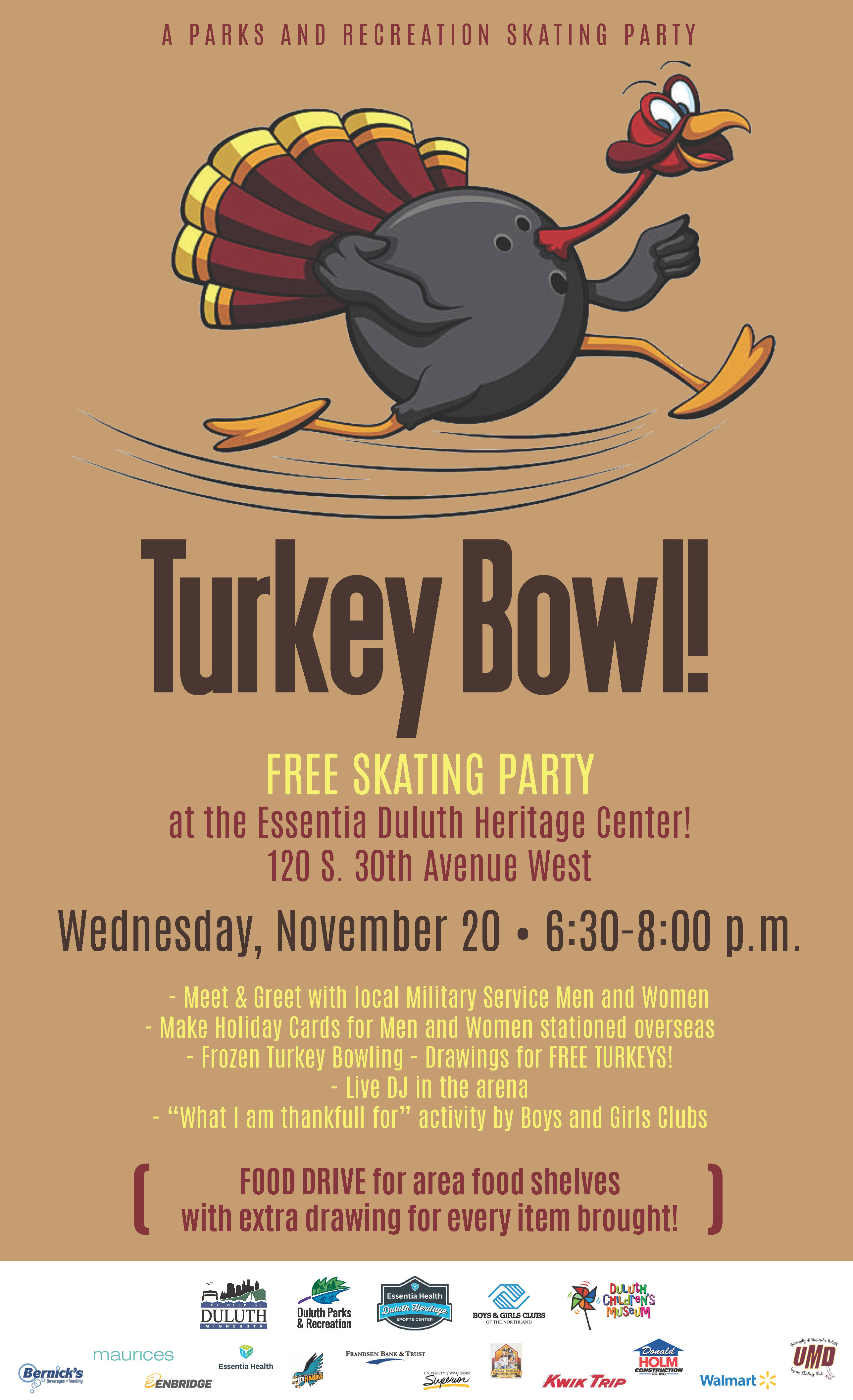 [Duluth, MN] The Duluth Parks and Recreation Turkey Bowl Skating Party will take place on November 20, from 6:30 – 8:00 p.m. at the Essentia Health Duluth Heritage Center. Attendees can participate in the following activities: