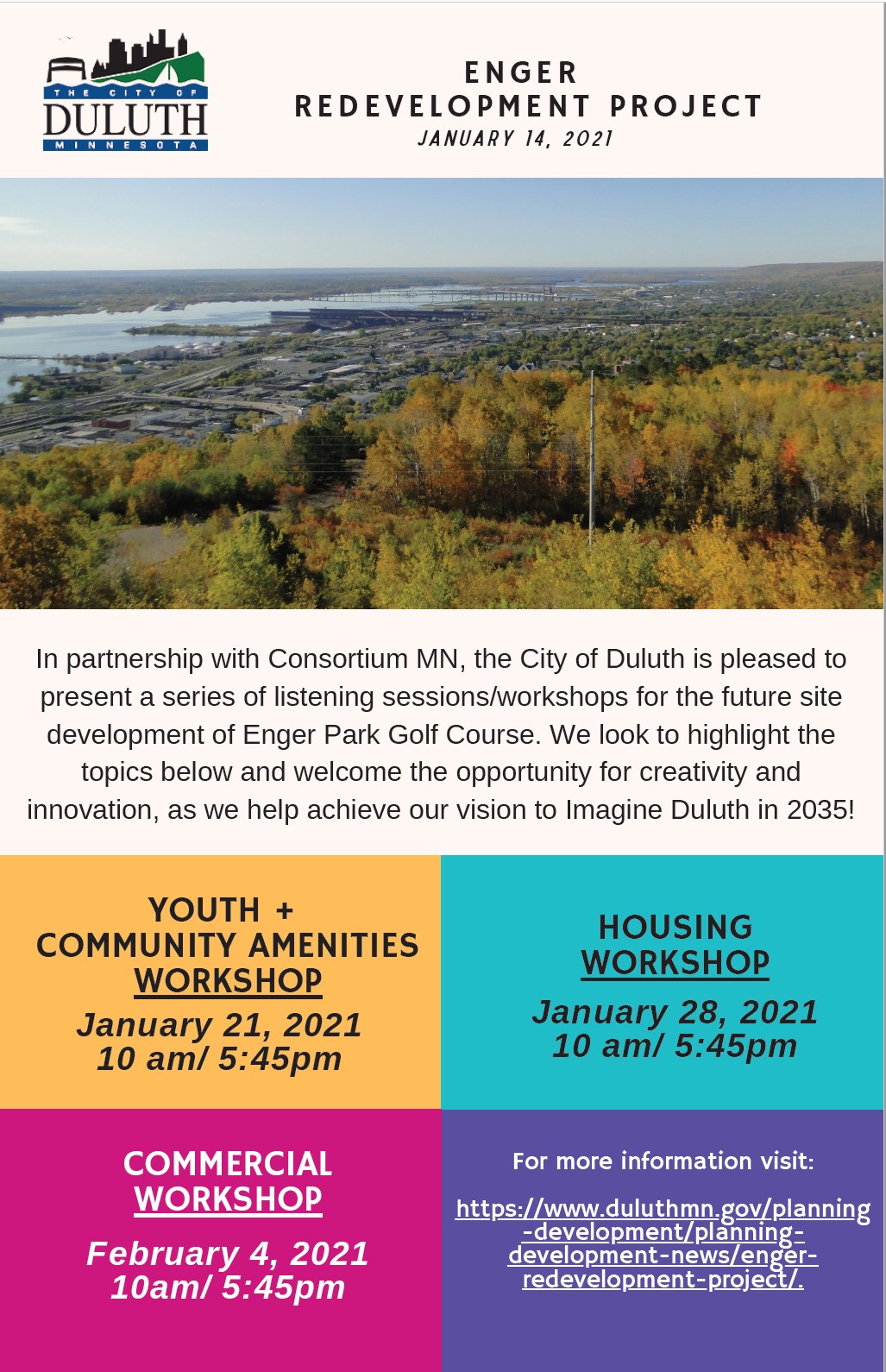 For more information, including Zoom log-in information for the meeting, please visit https://www.duluthmn.gov/planning-development/planning-development-news/enger-redevelopment-project/.