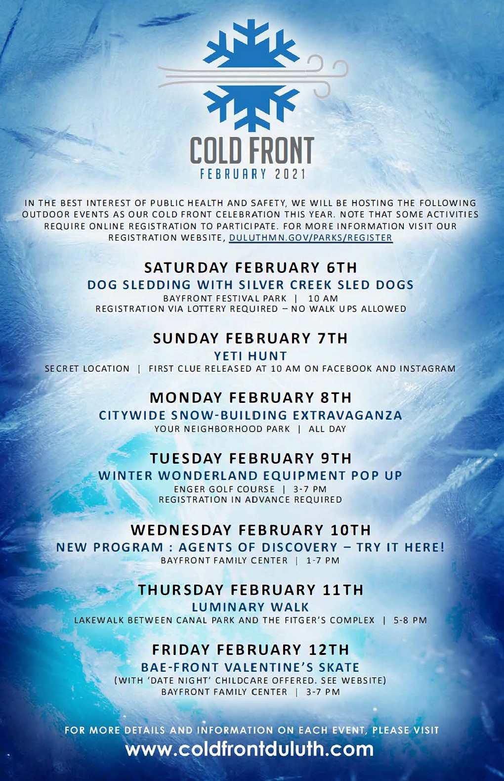 Note that some activities require online registration to participate, more information on our registration site at duluthmn.gov/parks/register under the Cold Front 2021 tab.