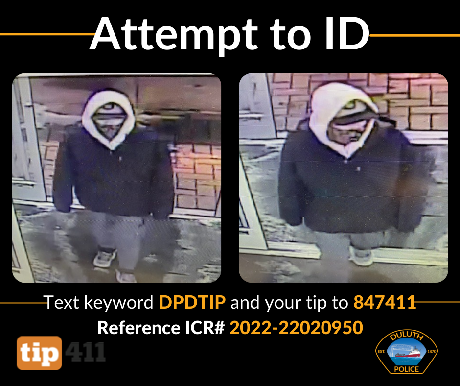 The Duluth Police Department is seeking the public’s assistance in locating the individual in the below photo. This is in relation to a robbery that occurred at CVS Pharmacy Monday evening.