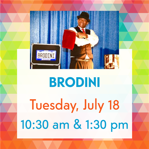 Brodini Comedy Magic Show - 10:30 am and 1:30 pm: Join us for a high-energy, interactive comedy and magic show with Brodini! Known as Wizzo the Wizard as a kid, Brodini loved Harry Houdini and learned everything he could about Houdini and taught himself how to be a magician by reading books. Brodini's unique blend of comedy and magic will boost spirits and test powers of concentration as he manipulates ropes, scarves, balls, and other props in a perplexing performance. Come ready to participate!
