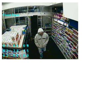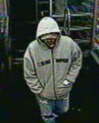 The suspect is described as a white male, mid twenties, 5’10”-5’11” tall, average build, and unshaven. He was wearing a gray hooded zip up sweatshirt with black lettering on the front, light blue jeans with holes in the knees, baseball cap, and light colored shoes with dark soles.