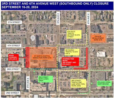 Drivers are advised, when possible, to seek alternative routes through the area due to other ongoing construction, as traffic delays are likely. Consider utilizing Lake Avenue or approaching the hospital district from the west, using Second Street if possible. Northbound traffic on Sixth Avenue East will remain open but ongoing construction work at a private development may reduce the lanes available. Drivers’ patience is appreciated during the closure period.